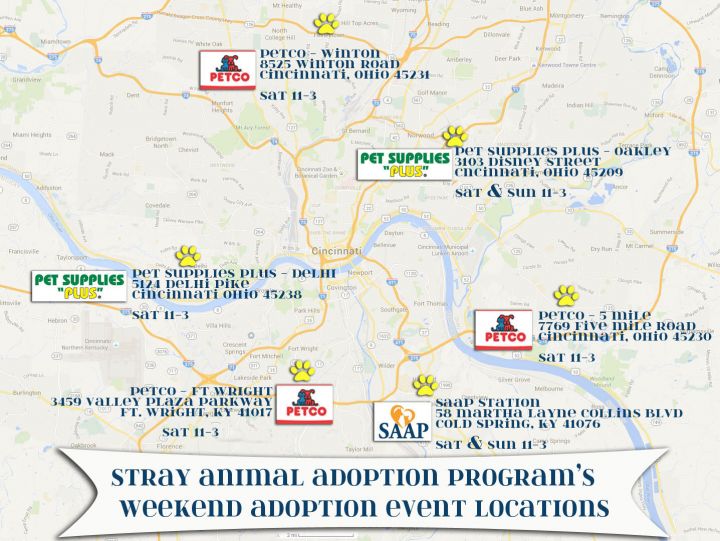 Oakley Petsmart SATSUN 11 AM 3 PM 3401 Alamo Ave Cincinnati OH. All donations are tax-deductible and 100 of your donation will go towards the rescue care and medical needs of the animals. If you need info on a cat or kitten please contact 859-391-2944.